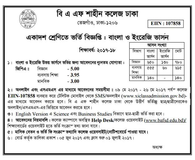 B A F Shaheen College Dhaka has published an admission circular for Intermediate (HSC) 1st year in both Bangli and English version. Admission in English version for the group of science & commerce students only. Students can apply through SMS from teletalk mobail.