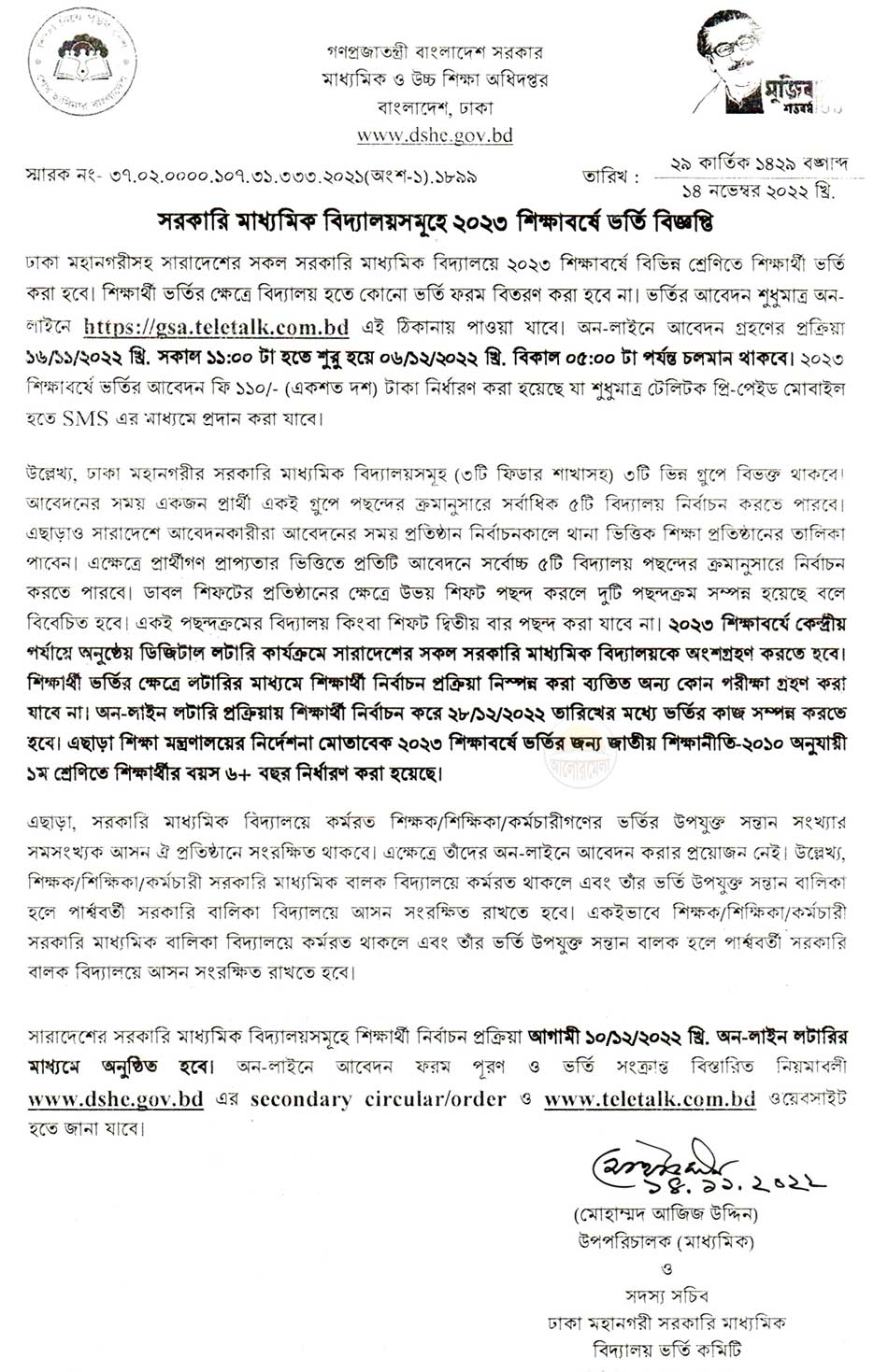 Government and non-government schools class-1 to class-9 admission's online application has been started from 24 October and the application process will be closed on 14 November 2023. Apply now to build a batter future for your child.