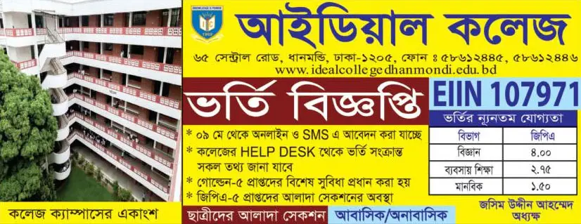 Ideal College at Dhanmondi in Dhaka has published intermediate 1st year admission circular 2017. It is a well known college in Bangladesh. It has Class Room, Library, Auditorium, Computer Laboratory, Science Laboratory, Generator, and lift, Canteen, Special Facilities and Prayer Room.
