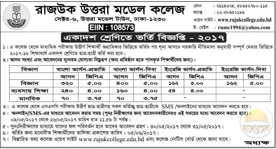 Rajuk Uttara Model College (RUMC) has published intermediate 1st year admission circular 2017. RUMC have two version education system and 02 shift. Science group students can apply both shift but Business group students can apply only morning shift. Student can apply through SMS from teletalk mobile.