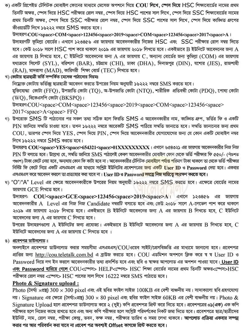 1st SMS: COU<space>1st Three latter of HSC Exam Board Name<space>HSC Roll<space>HSC Year<space>1st Three letter of SSC Exam Board Name<space>SSC Roll<space>SSC Year<space>Unit Name send to 16222.