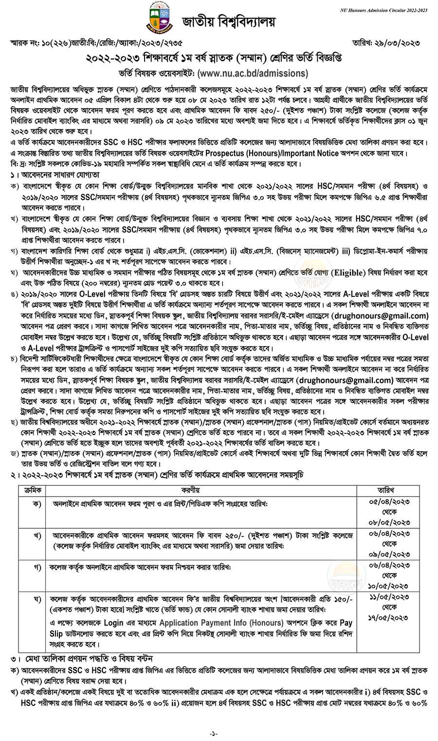 National University (NU) Bangladesh is the largest University in Bangladesh. NU published the honors first-year (1st) admission notice for the session 2024-2025 on 20 January 2025. The online application has been started on 21 January and will be ended on 28 February 2025. The university has decided to take admission test from this year.
