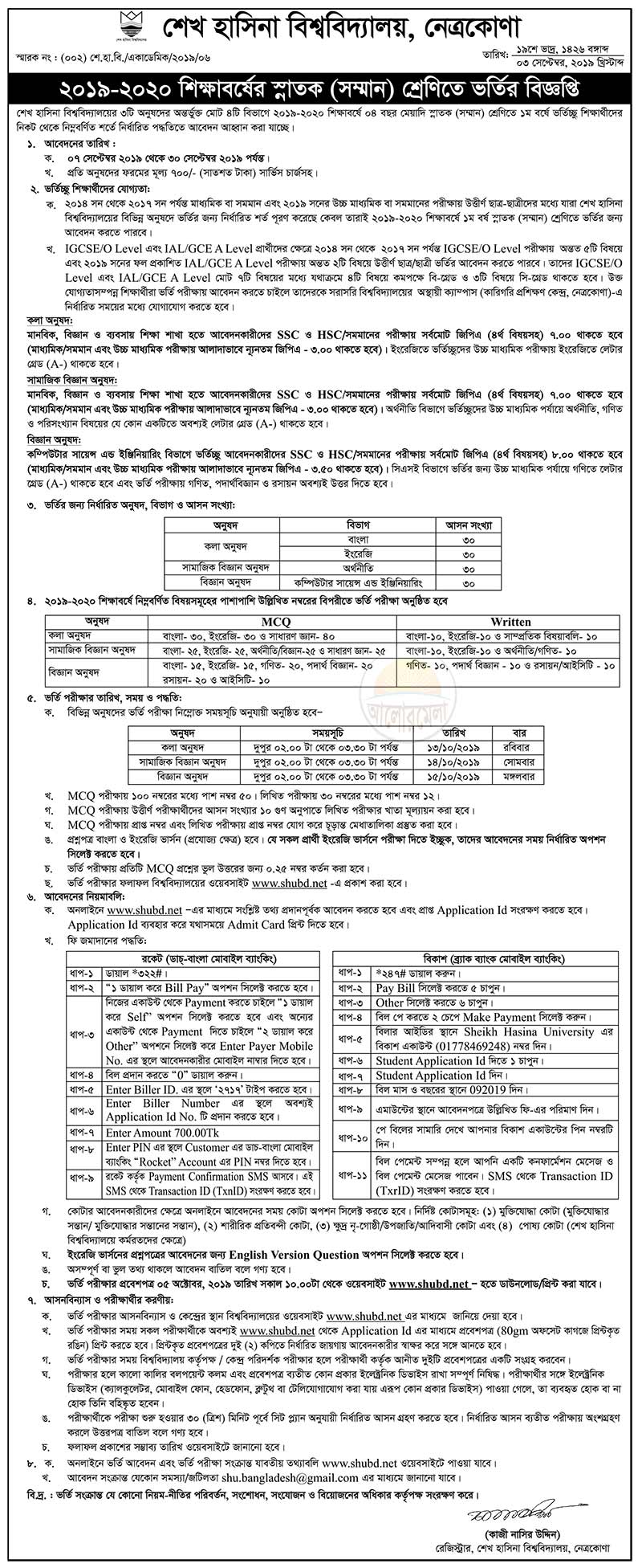 Circular 2019-20: Sheikh Hasina University's admission application has been started from 07 September and the last date of online application submits 30 September 2019. Total available seats for admission are 120 under three faculties, these are Arts, Social Science and Science.
