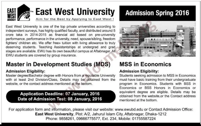 Application are invited for admission Spring 2016 to East West University Masters in Development Studies (MDS) and MSS in Economics. East West University is the only university with insurance facility for every students.