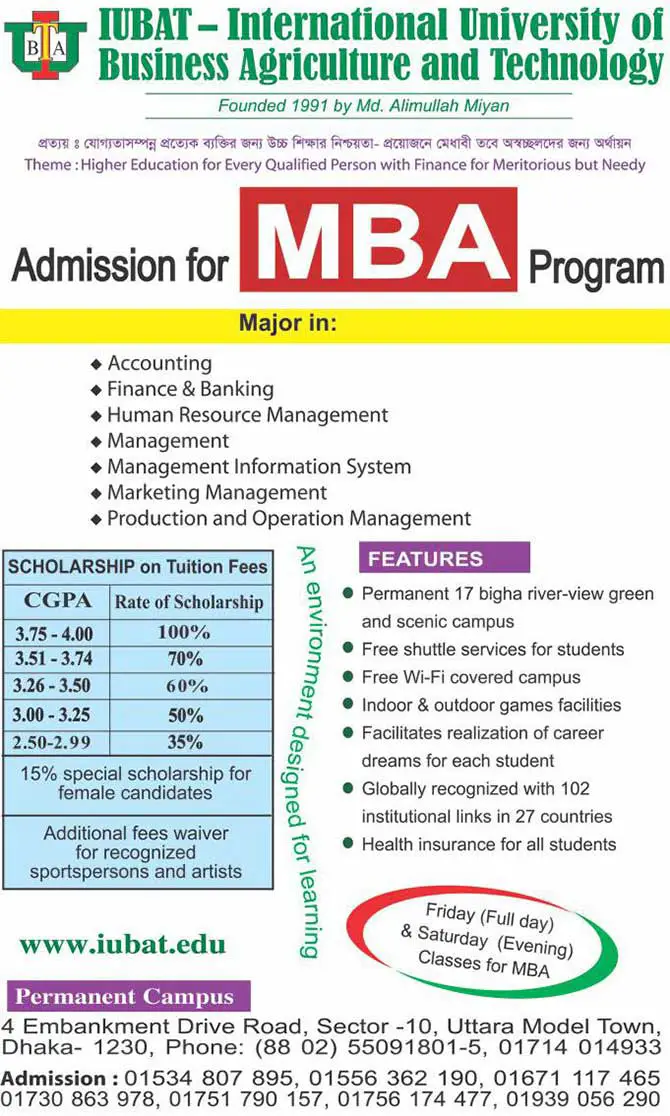 IUBAT offes Friday full day and saturday for evening classes for MBA students. Famale students will get 15 % scholarship and every body will get special scholarship on CGPA.