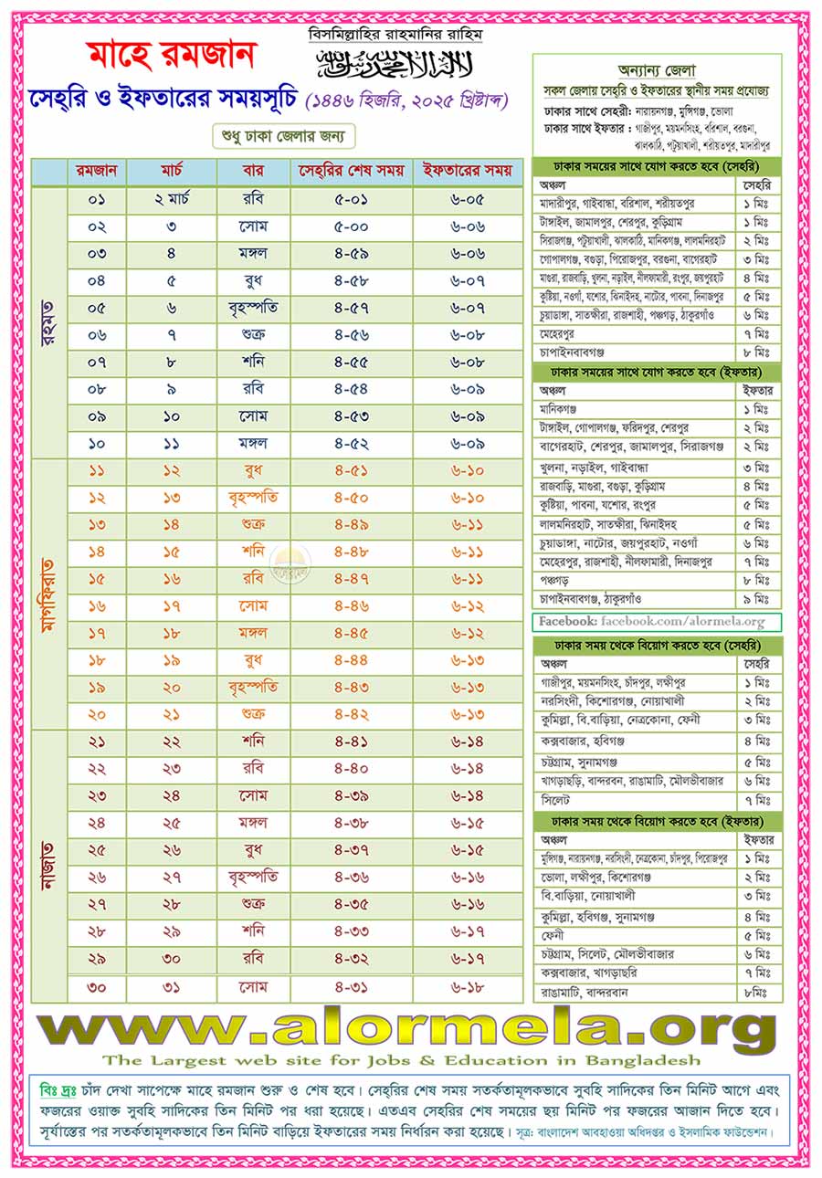 দেশের সকল জেলার অধিবাসীগনই ঢাকা জেলার সময়ের সাথে তাদের জেলার উল্লেখিত সময় সামঞ্জস্য করে এই সূচী অনুসরণ করতে পারবেন।
