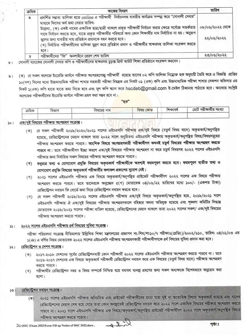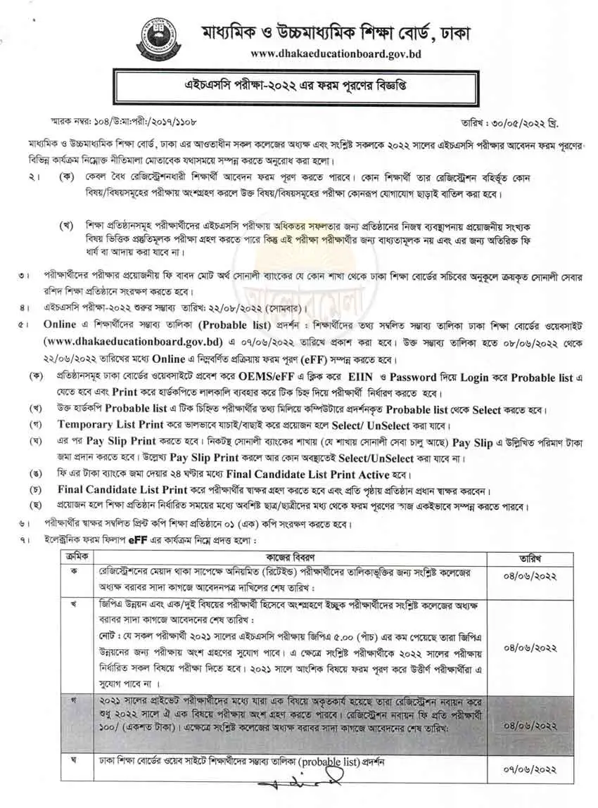 | HSC Exam 2022 Form Fill-up Starts | June 8, 2022 |