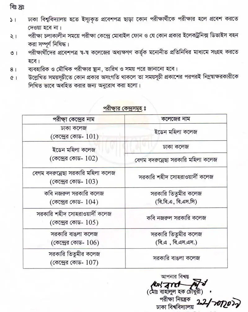 The examinee must get in the exam hall along with admit card which will be issued by the Dhaka University. The admit card have to collect from the student’s own colleges. The date of Practical exam and viva voce will be announced later.