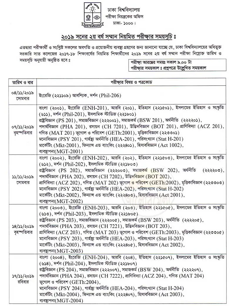 Dhaka University has announced affiliated seven colleges honours 2nd year exam routine for year 2019. The 2nd year exam is going to start from 04 November 2019 by the subject English and Philosophy. Exam starting time morning at 09:00am in every day.