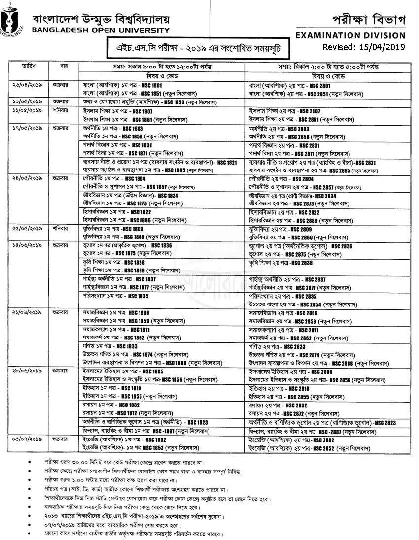 Bangladesh Open University HSC exam revised routine 2019 has been published in 15 April. The HSC examination will be started from 26 April 2019. This routine is applicable for the session 2019 and it is the last chance for batch 2013 .