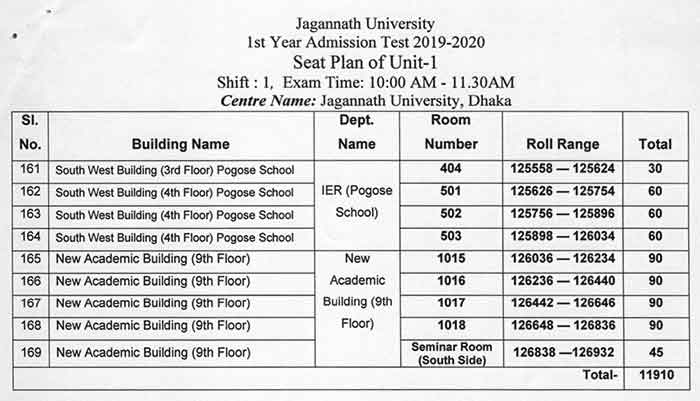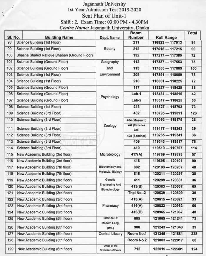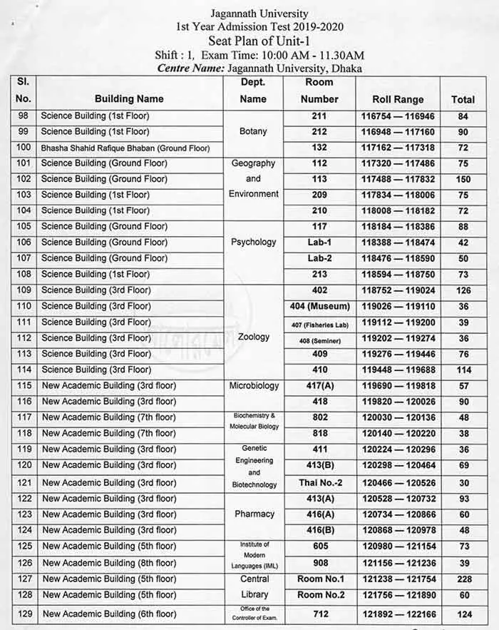 Jagannath Univesity published Unit-1 (Science) admission test seat plan. This exam has been held in 14 September 2019 for Unit-3 and 20 September for Unit-2. Unit-2 and unit-1 seat plan is given below, check unit-2 seat plan from the given link and unit-1 as picture as odd and even roll number.