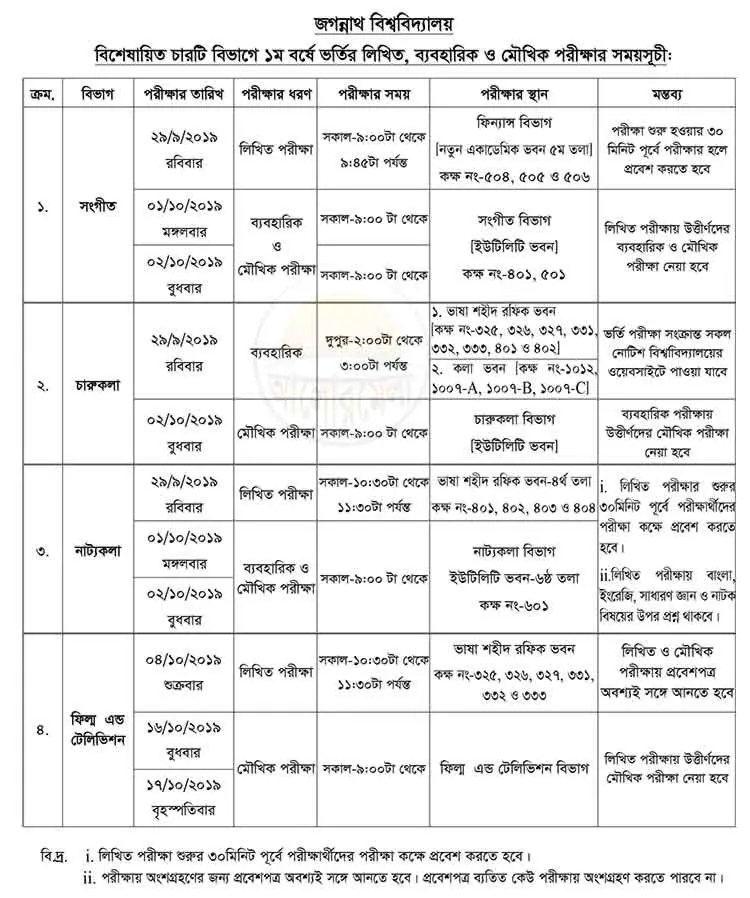 Jagannath University (JNU) has published music department viva schedule and you can get here. The admission test for "Unit-1" will be held on Saturday, 21 September 2019. JNU"Unit-2" exam has been held in 20 September and "Unit-3" in 14 September. The details seat plan is available here.