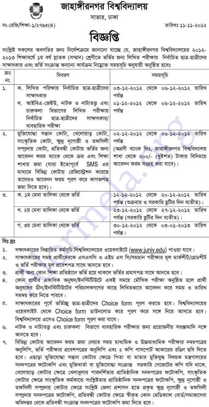 Jahangirnager University 1st year honors Admission Test 2012-2013 has been finished some days back and all units result has been published. Viva schedula of 1st year honors admission of Jahangirnager University announced. The viva exam of successful candidates who allowed on written test will be started from December 03, 2012.