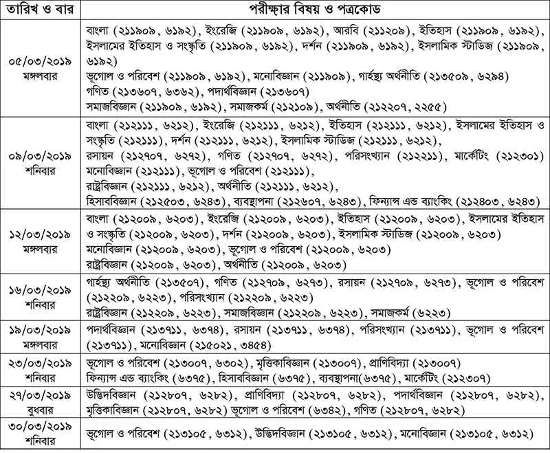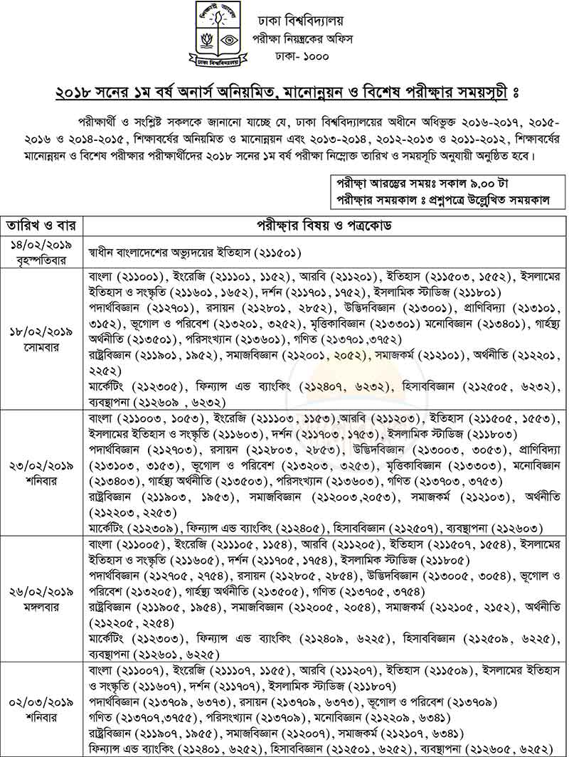 Honours 1st year exam routine of seven colleges under Dhaka University was published in 30 January 2019. The exam has been started from 14 February 2019 and the exam will be finished on 30 March 2019.