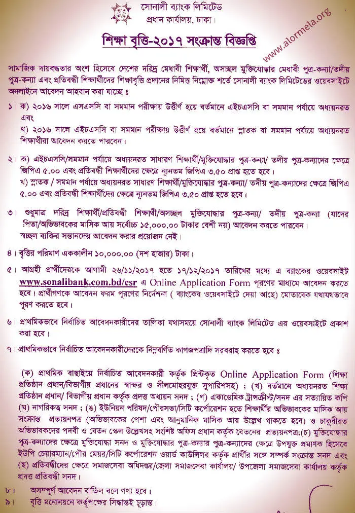 Sonali Bank has offered application for the scholarship from poor meritorious students, freedom fighters children and autism students. Students who are passed SSC/HSC/Graduation in 2016, they will be able to apply from here.