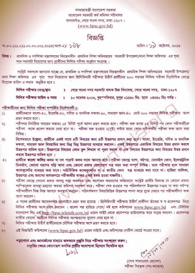 Assistant Upazila/Thana Education Officer (ATEO) written exam will be held on Thursday, 10 November 2016 at 1:30pm to 4:30pm only in Sher-e-Bangla Nagar Government Boys High School, Sher-e-Bangla Nagar, dhaka center.