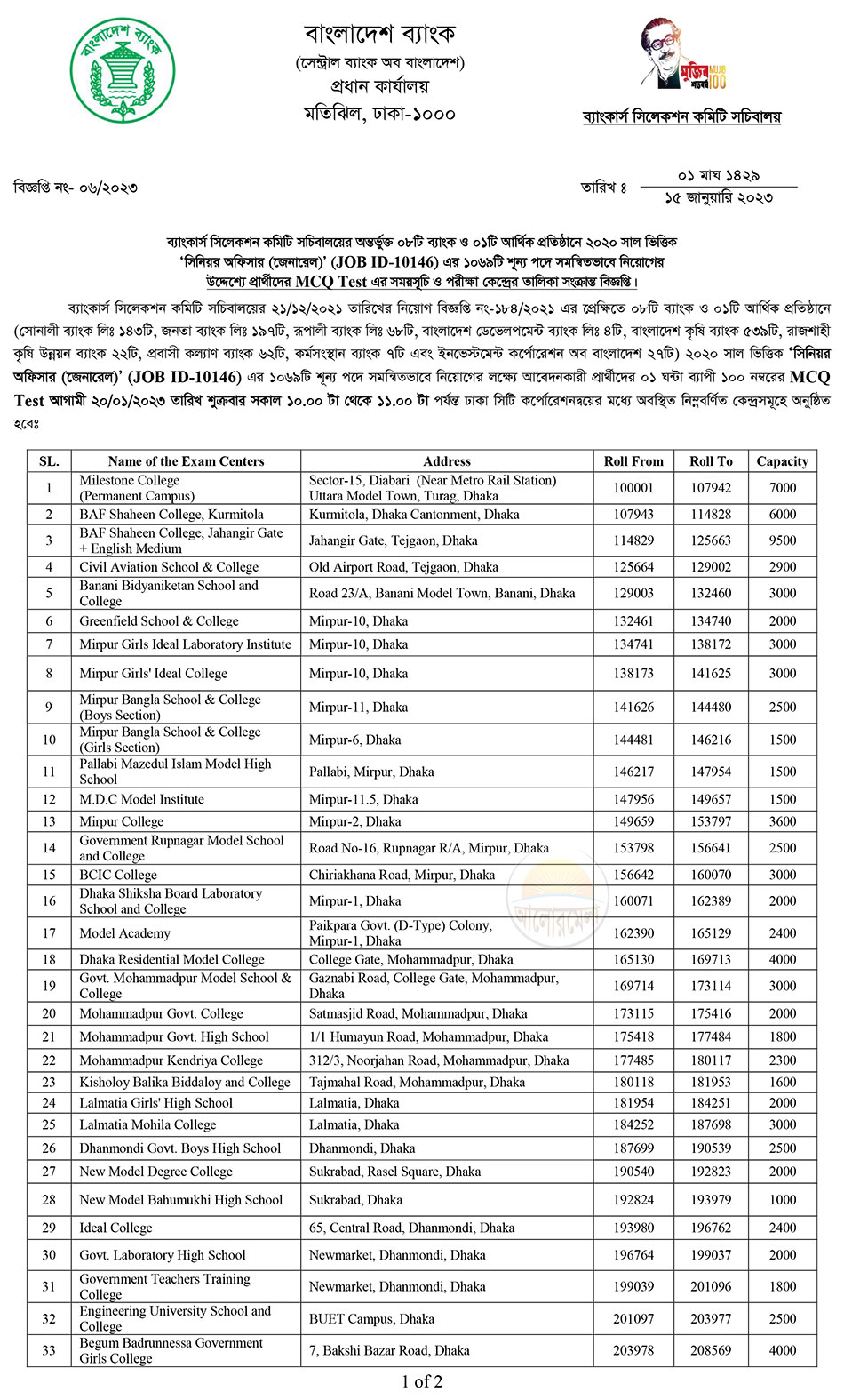 Bankers selection committee has announced the recruitment MCQ test admit card and seat plan for the post of Senior Officer (General) of eight bank and a financial institute's recruitment. The MCQ exam will be held on 20 January 2023 at 10:00am to 11:00am. You can get the seat plan from here.