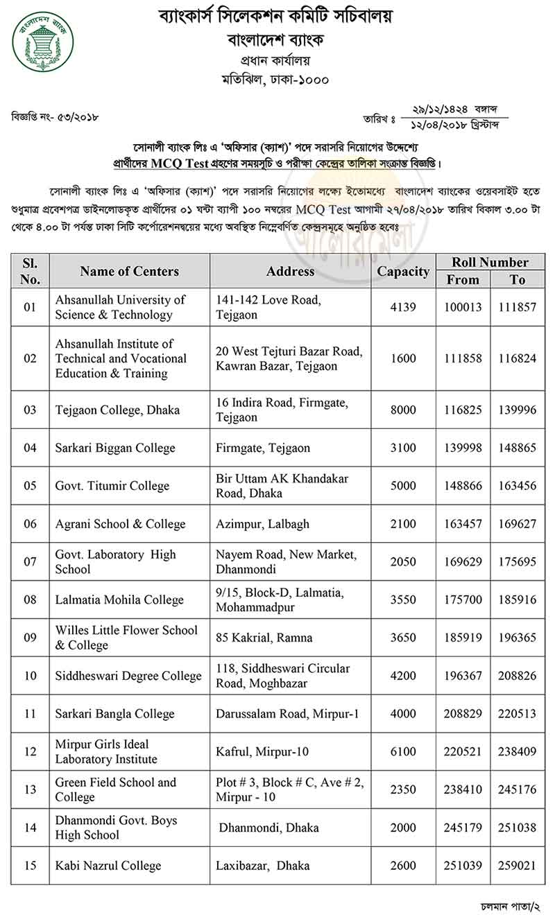 Sonali Bank has published Officer (Cash) MCQ exam schedule. Officer (Cash) MCQ exam will be held on 27 April 2018. Sonali Bank has announce the exam date and seat plan for the applied posts.