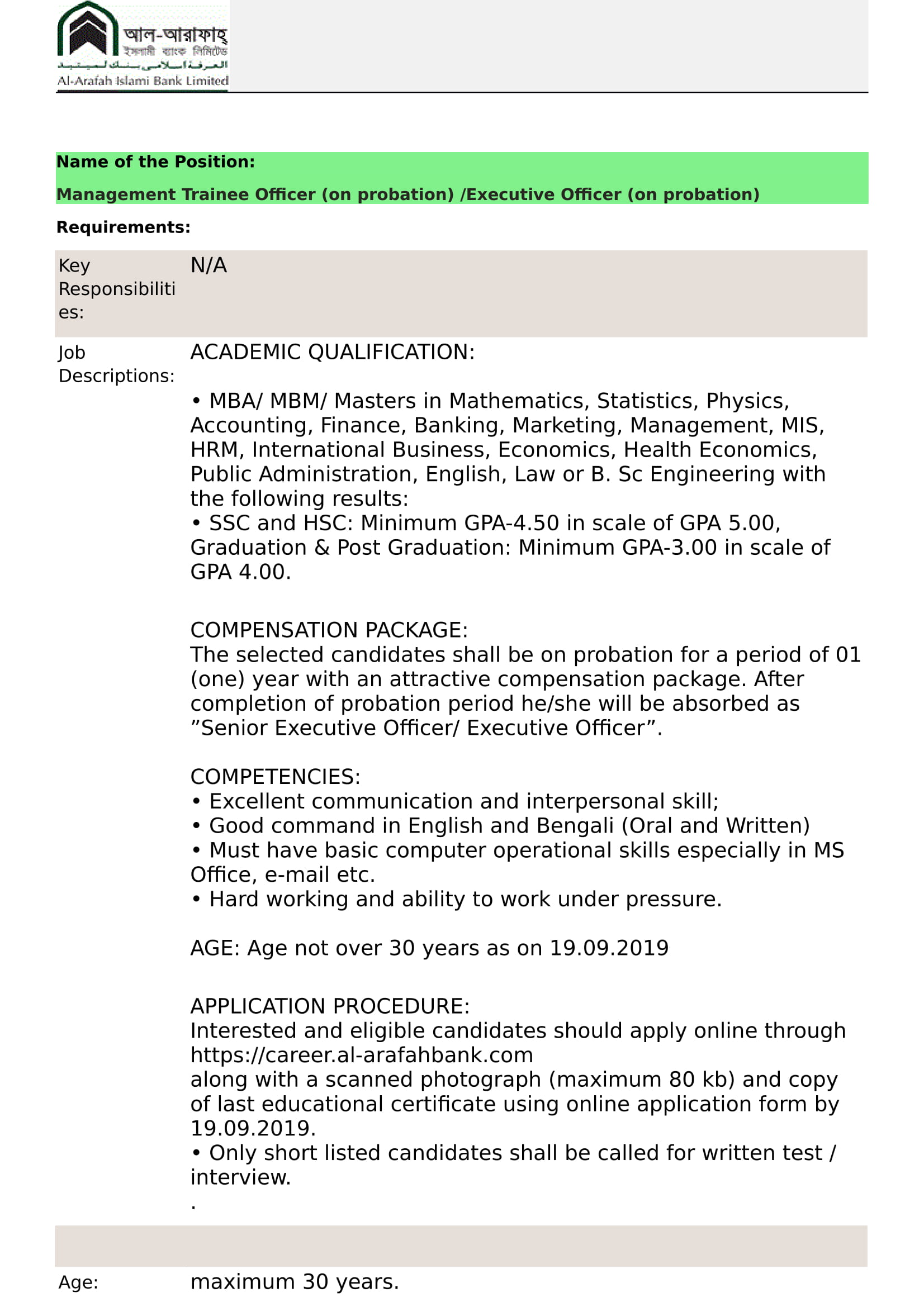 Al-Arafah Islami Bank Ltd is a second generation islami bank has invited application to join as Management Trainee officer and Executive Officer.
