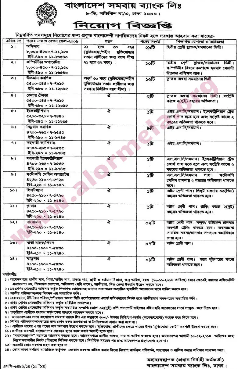 Requirement qualification must be completed 8th/SSC/HSC/Graduation Degree or equivalent exam. Candidates should be mention candidates name, father's/husband's name, mother's name, permanent & present address, birth date, age, education qualification, experience (if you have), nationality, own district name etc on application form. The application will be submitted with attested photocopies of educational certificates & birth registration card, national certificate from chairman, characteristic certificate and 2 copy passport size photographs. The application will also be attached taka 300/- pay-order favor in the Bangladesh Samabaya Bank Limited. The last date of application on 18 December 2014. Detail is given here.