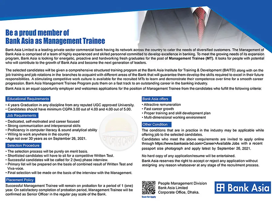 Bank Asia Limited, the fastest growing commercial bank in private sector of Bangladesh is looking for young, energetic and experience Graduate applicants for the posts of Management Trainee with an attractive compensation package, smooth career progression and execellent working Environment.