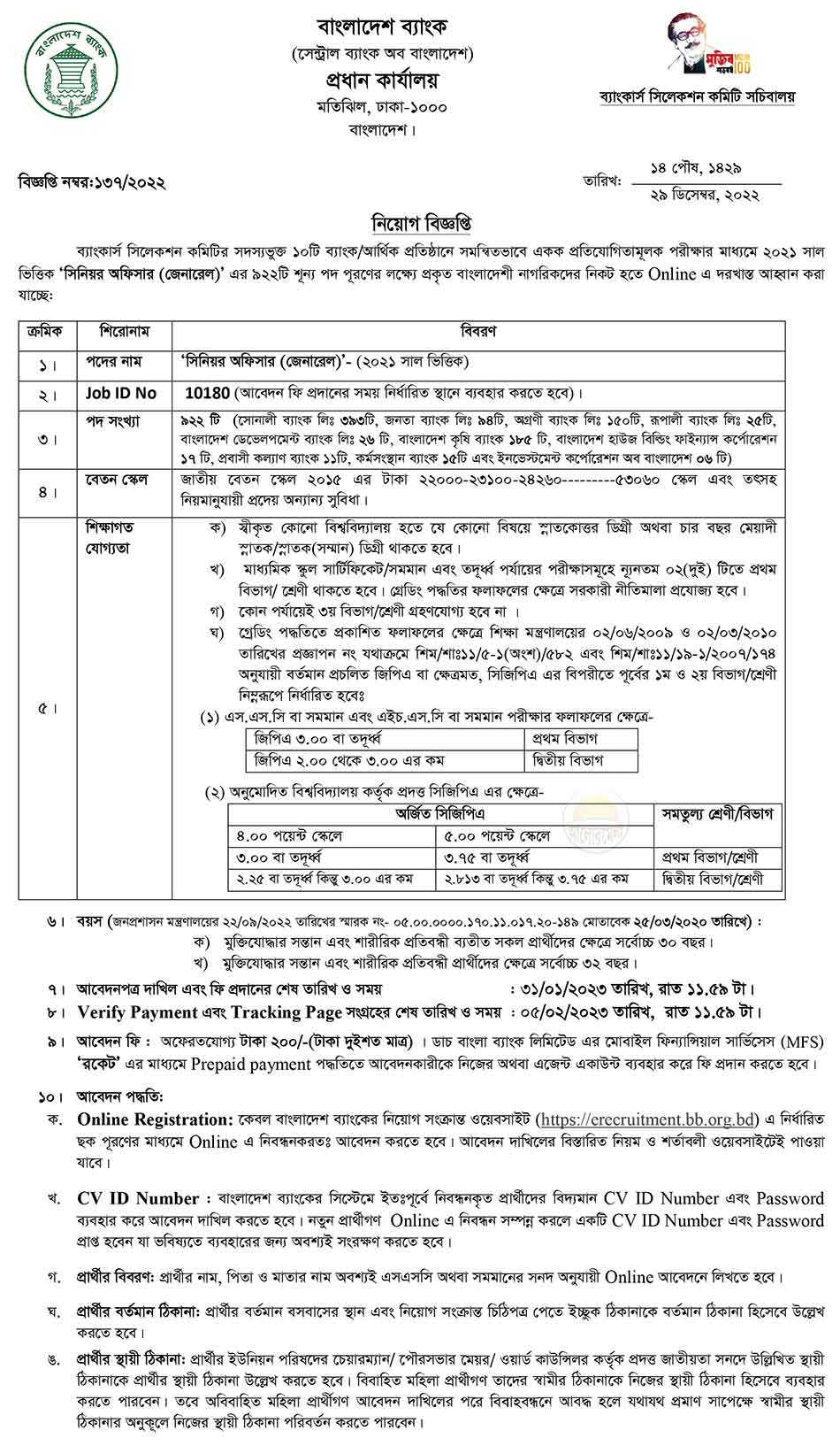 10 Banks and financial organizations are the member of Bankers Selection Committee of Bangladesh Bank and published a job circular for the post of Senior Officer. Total vacant posts are 922. The application is invited through the online. Interested candidates can apply until 31 January 2023.