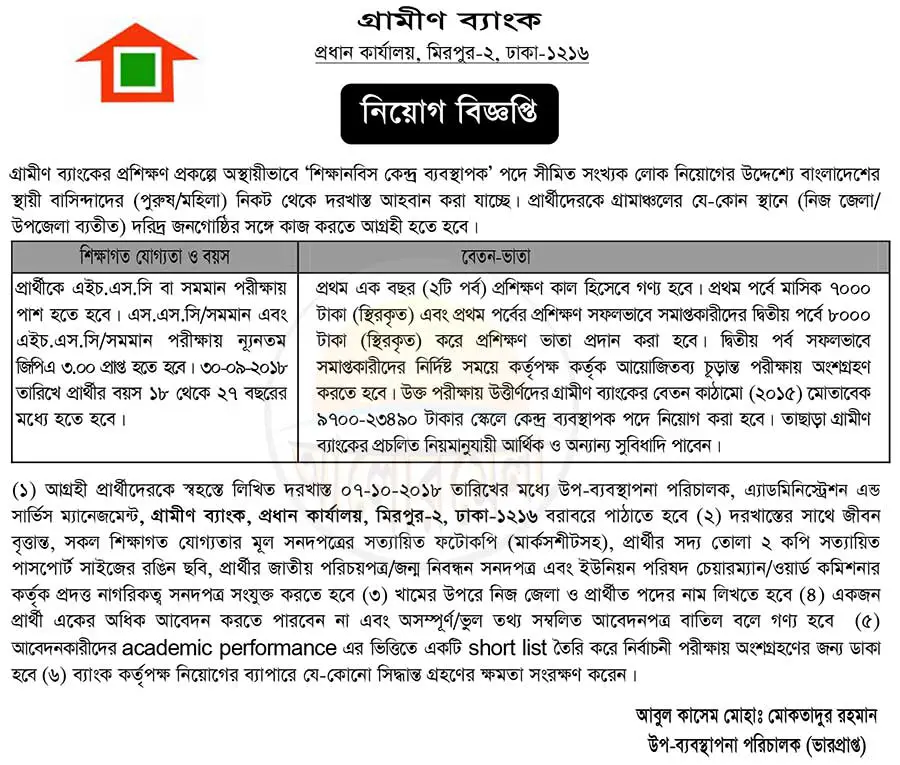 Grameen Bank is going to recruit some skillful people for the post of "Learner Center Manager". The application is called from the Bangladeshi citizen who have passed the education level HSC exam.