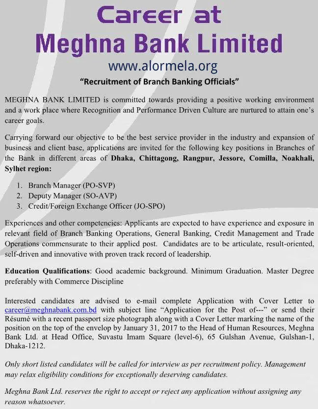 A fourth generation Bank, Meghna Bank Limited has been invited application to hire for the post of "Branch Manager (PO-SVP), Deputy Manager (SO-AVP) and Credit or Foreign Exchange Officer (JO-SPO)".