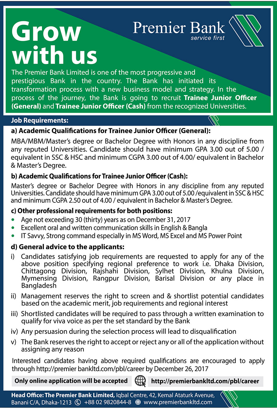 The leading commercial private bank the Premier Bank Limited has published a job circular for the post of Trainee Junior Officer (General) and Trainee Junior Officer (Cash). Educational qualification are MBA, MBM, BBA, Masters degree or 04 years Graduation degree with minimum CGPA 3.00 or 2.5 from any reputed university.