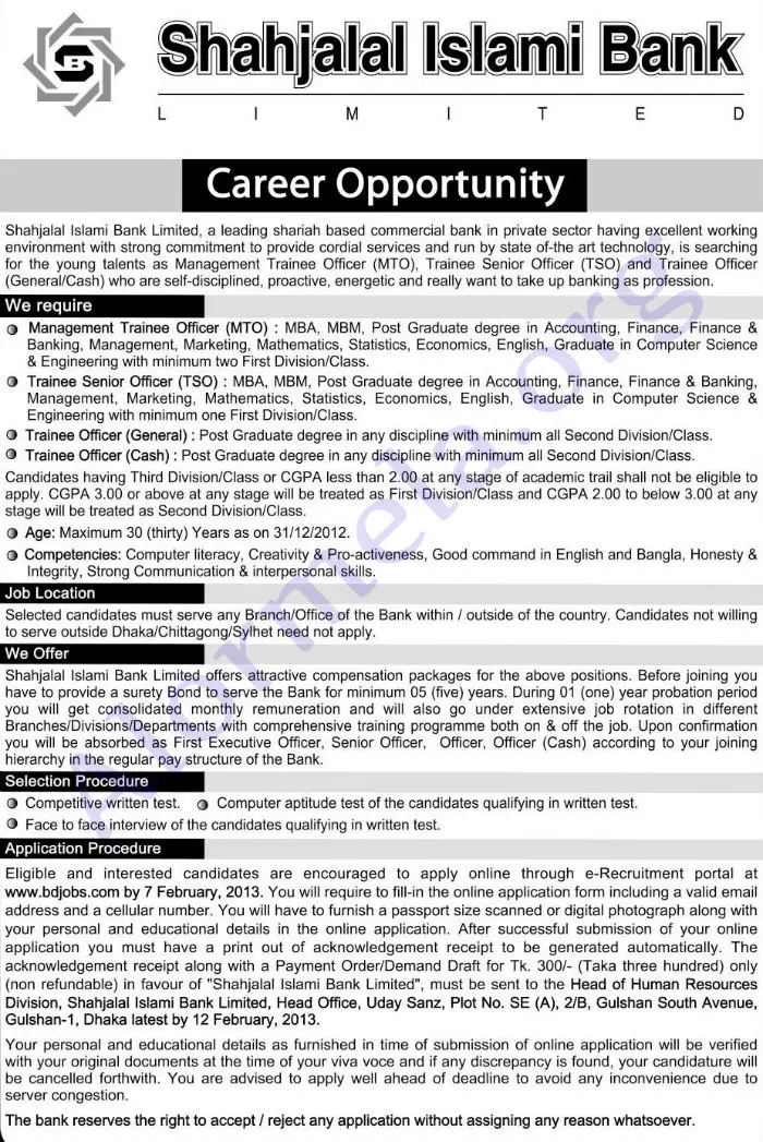 Shahjalal Islami Bank Limited has invited application from self-disciplined, proactive, energetic and eligible candidates for some vacant position of the bank with attractive compensation packages. The last date of submitting online application is February 07, 2013.