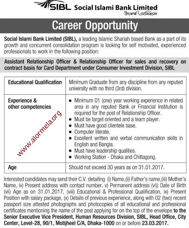 Social Islami Bank is a shariah based bank looking for some young and smart hard worker for the posts of Assistant Relationship Officer and Relationship Officer. Education qualification should have graduation degree from any reputed university.