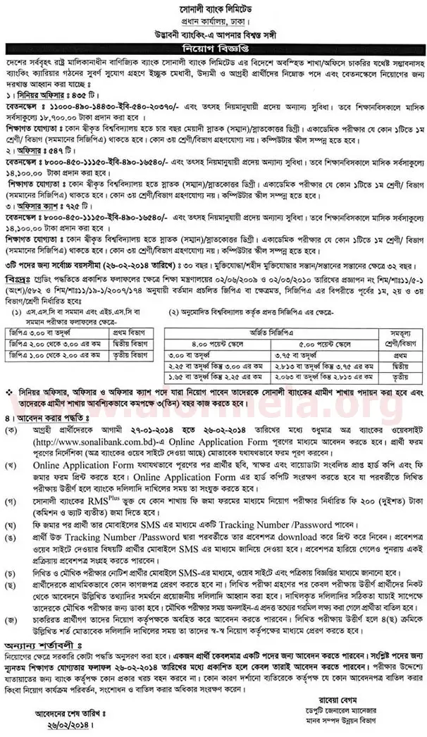 Sonali Bank The largest commercial government bank of Bangladesh has invited application from interested candidates for the post of senior officer, officer and officer cash. Candidate's requirement educational qualifications for these posts are mentioned here.