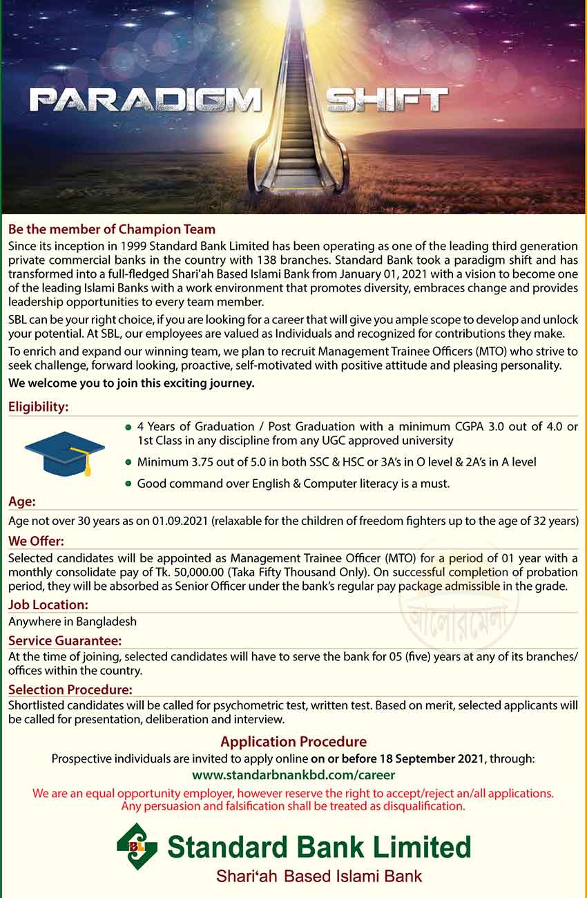 Standard Bank Limited has published a job circular for the post of Management Trainee Officer MTO for the 4 years graduation degree completed fress candidates. Starting salary 50,000 taka.