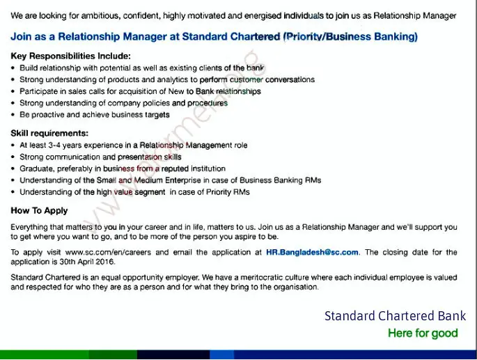 Standard Chartered Bank is a foreign commercial bank in Bangladesh is looking for ambitious, confident, highly motivated individuals to appointment for the posts of Relationship Manager. Academic qualification Graduation preferable in business from any reputed university.