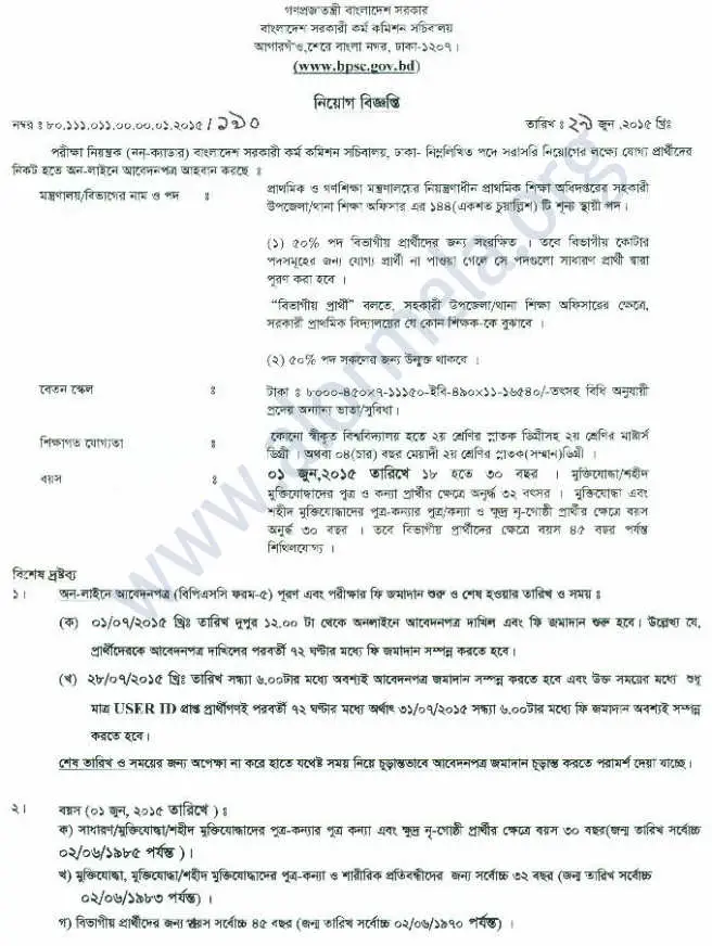 Age on 01/03/2015: 30yrs for general candidates (Age limit: 02/06/1997-02/06/1985). 45yrs for divisional candidate (for primary School Teachers). For freedom fighter and physically challenged candidates 32yrs (Age limit: 02/06/1997-02/06/1983).