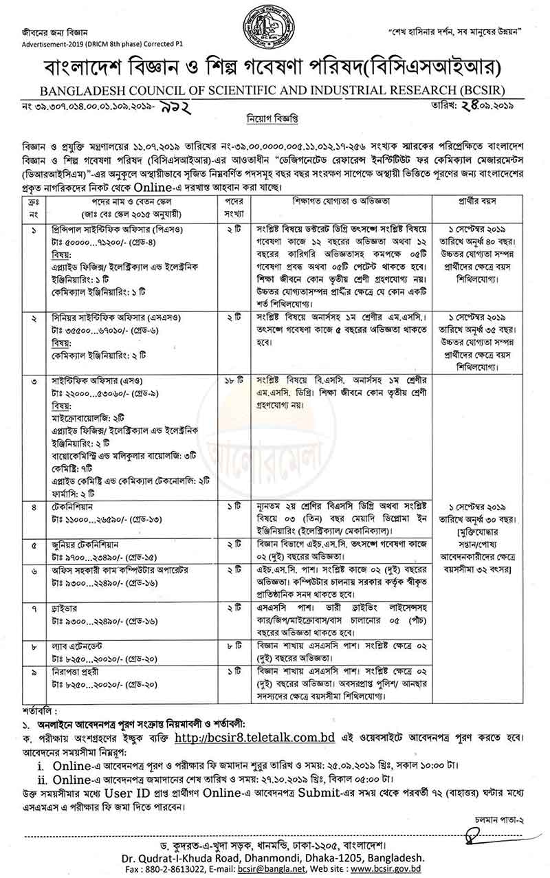 Bangladesh Council of Scientific & Industrial Research (BCSIR) has called application to fill up 38 vacant position. Vacant position name are Principal Scientific Officer, Senior Scientific Officer, Scientific Officer, Technician, Junior Technician, Office Assistant cum Computer Operator, Driver, Lab Attendant and Security Guard.