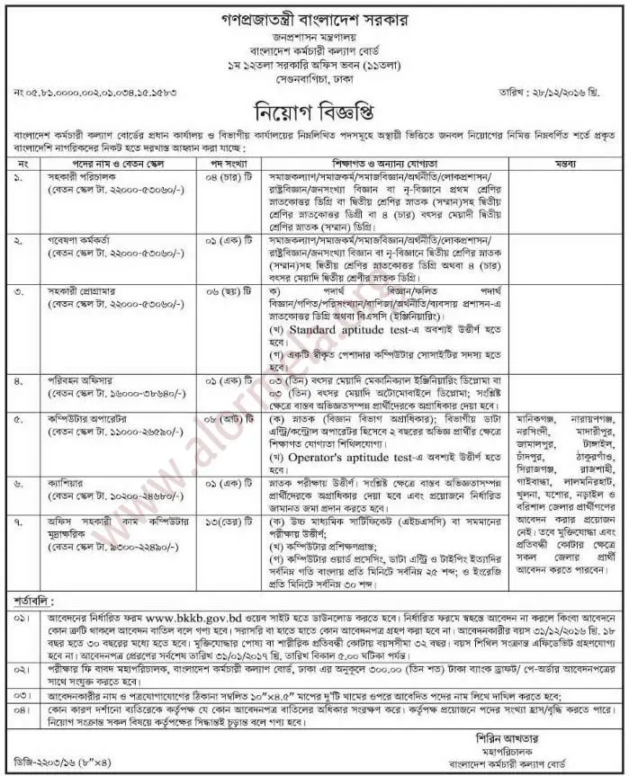 Candidates must be attached 300tk bank draft or pay-order form with application. Application mailing address to "the Director General, Bangladesh Karmachari Kallyan Board, 12 Floor Government Office Building (11 Floor), Segonbagicha, Dhaka. Application dead line is 31 January 2017 at 05pm.