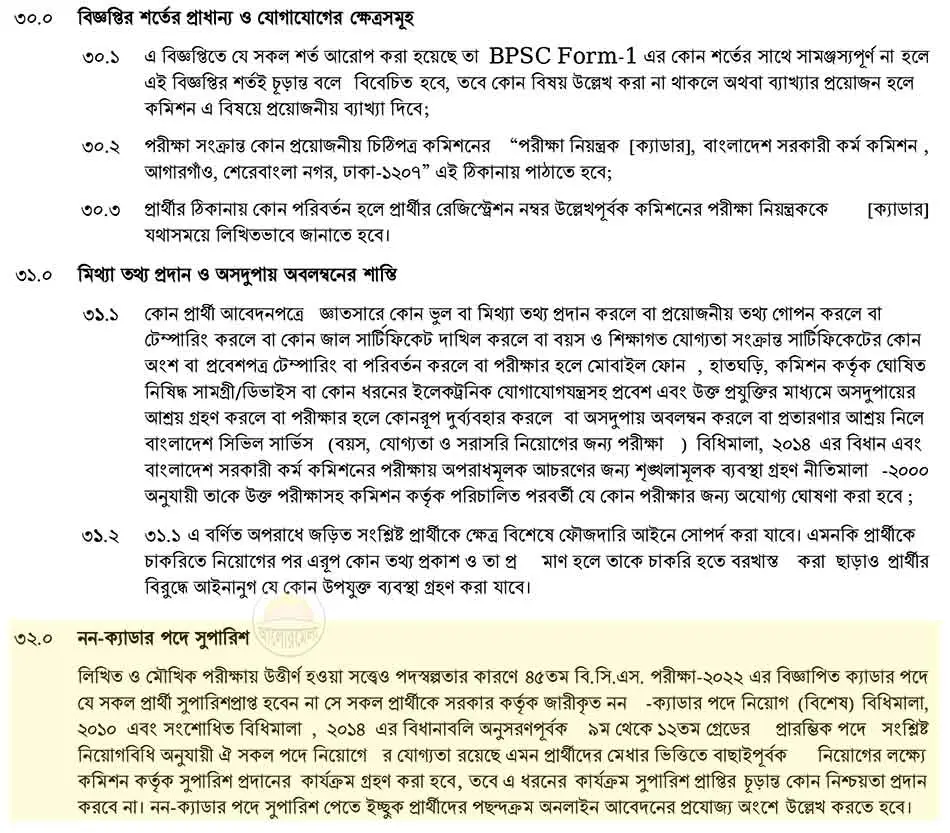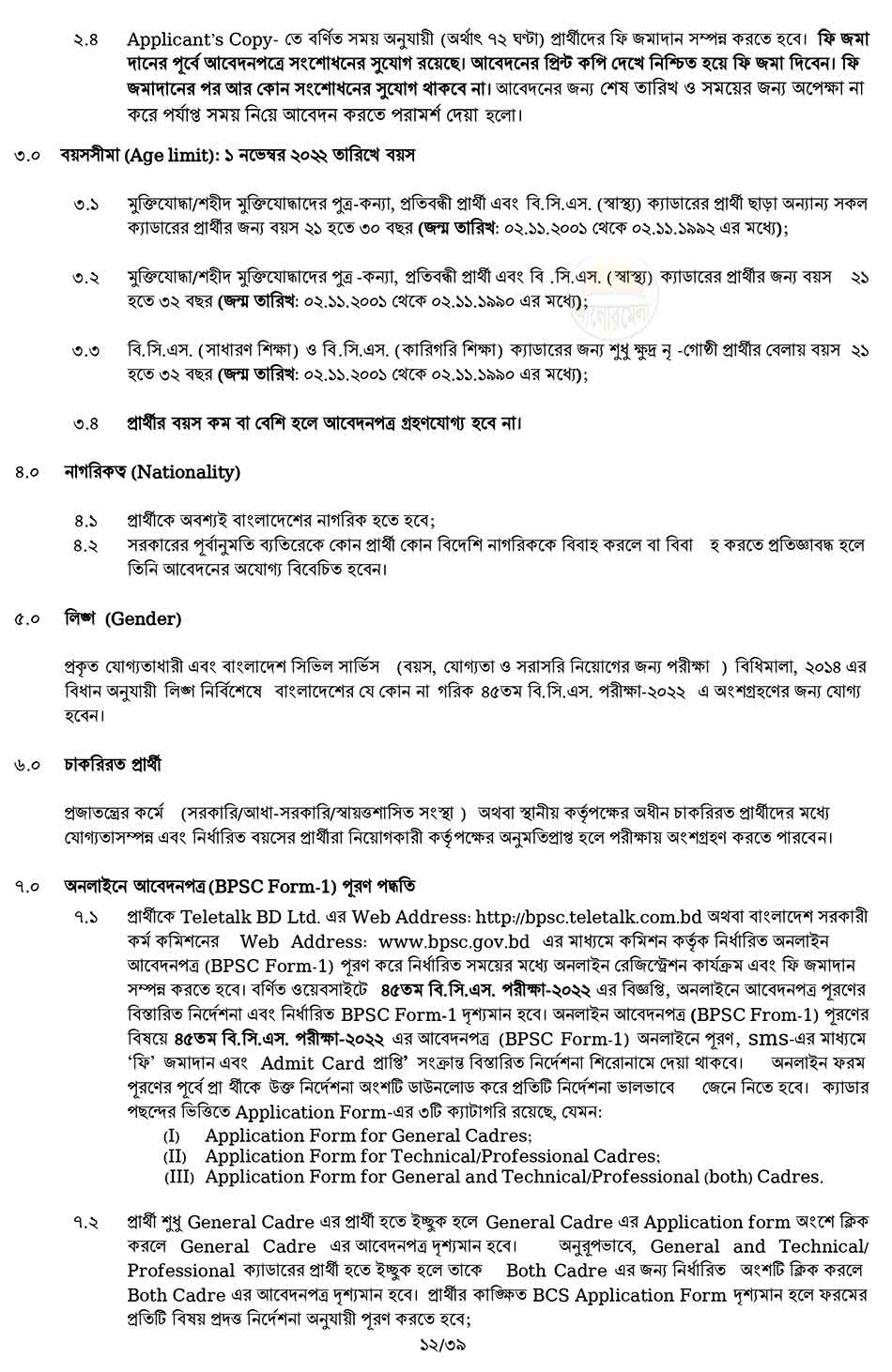 Last 45th BCS Circular: 45th BCS preliminary exam taken in 19 May 2023. The 45th general circular was published in 30 November 2022 and application timeline was 10 December 2022 to 31 December 2022 and total cadre posts were 2,309 and non-cadre were 1,022.