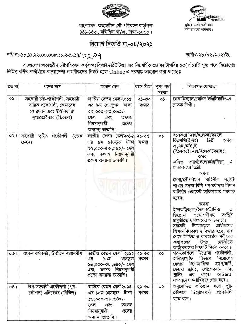 Bangladesh Inland Water Transport Authority (BIWTA) has published a job circular for the vacancy posts. The vacancy posts name are Neval Engineer, Assistant Tidal Anlyst, Art Officer, Senior Designer, Junior River Broker, Assistant Accounts Officer, Assistant Finance Officer, Assistant Audit Officer, Lower Division Assistant/Typist, Assistant Store Keeper, Driver, Cook, Greasier, Record Keeper, Marksman, Leadsman.