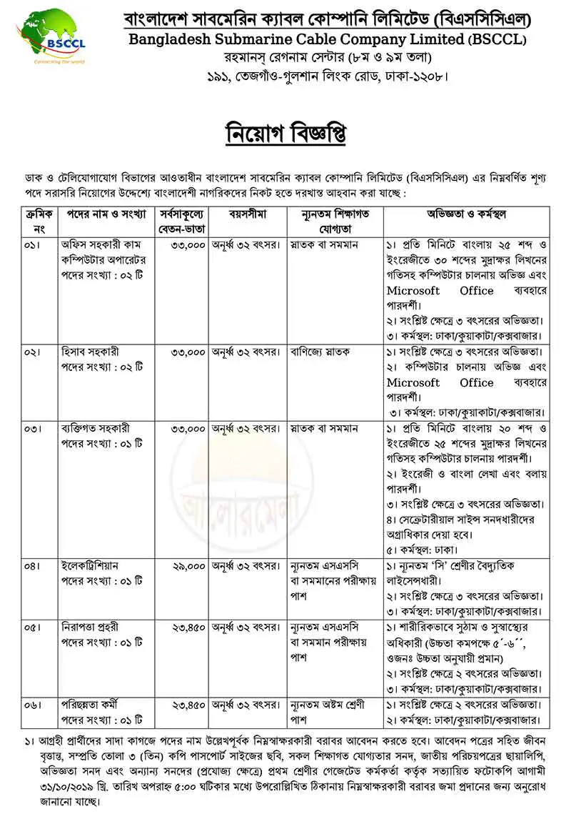 Bangladesh Submarine Cable Company Limited BSCCL is government operated public limited company which is controlled by Posts and Telecommunications division. BSCCL has called for application to recruit employee for the vacant position.