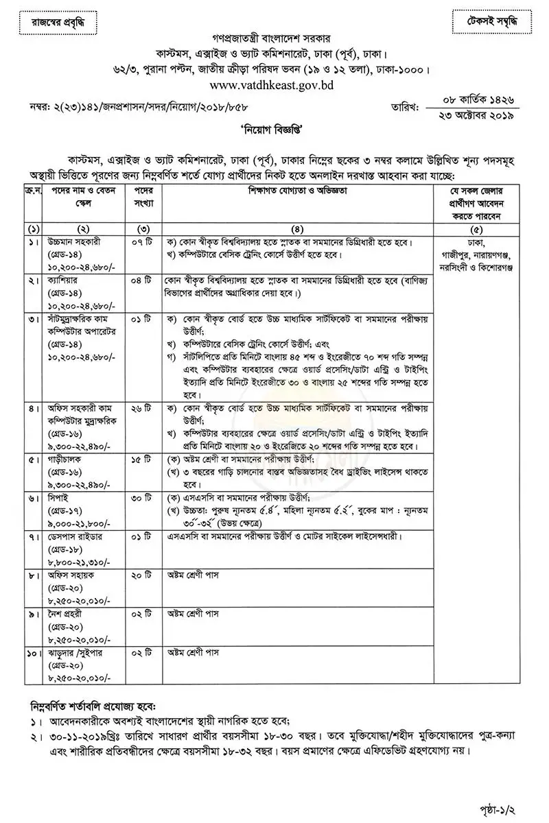 Customs, Excise & VAT Commissionerate, Dhaka and Khulna has called application for the various job position under salary scale 11-20 grade. Candidates who have mentioned qualification they can apply to join.