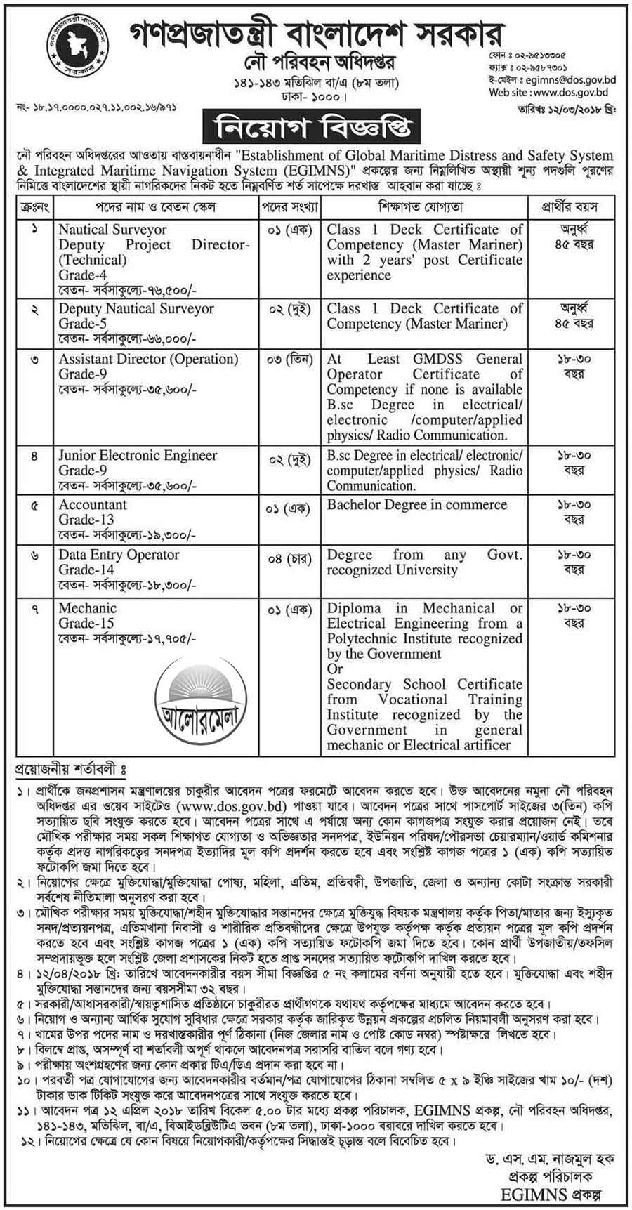 Department of shipping invited application to recruit some skilled people for the project "Establishment of Global Maritime Distress and Safety System and Integrated Maritime Navigation System (EGINMS)".