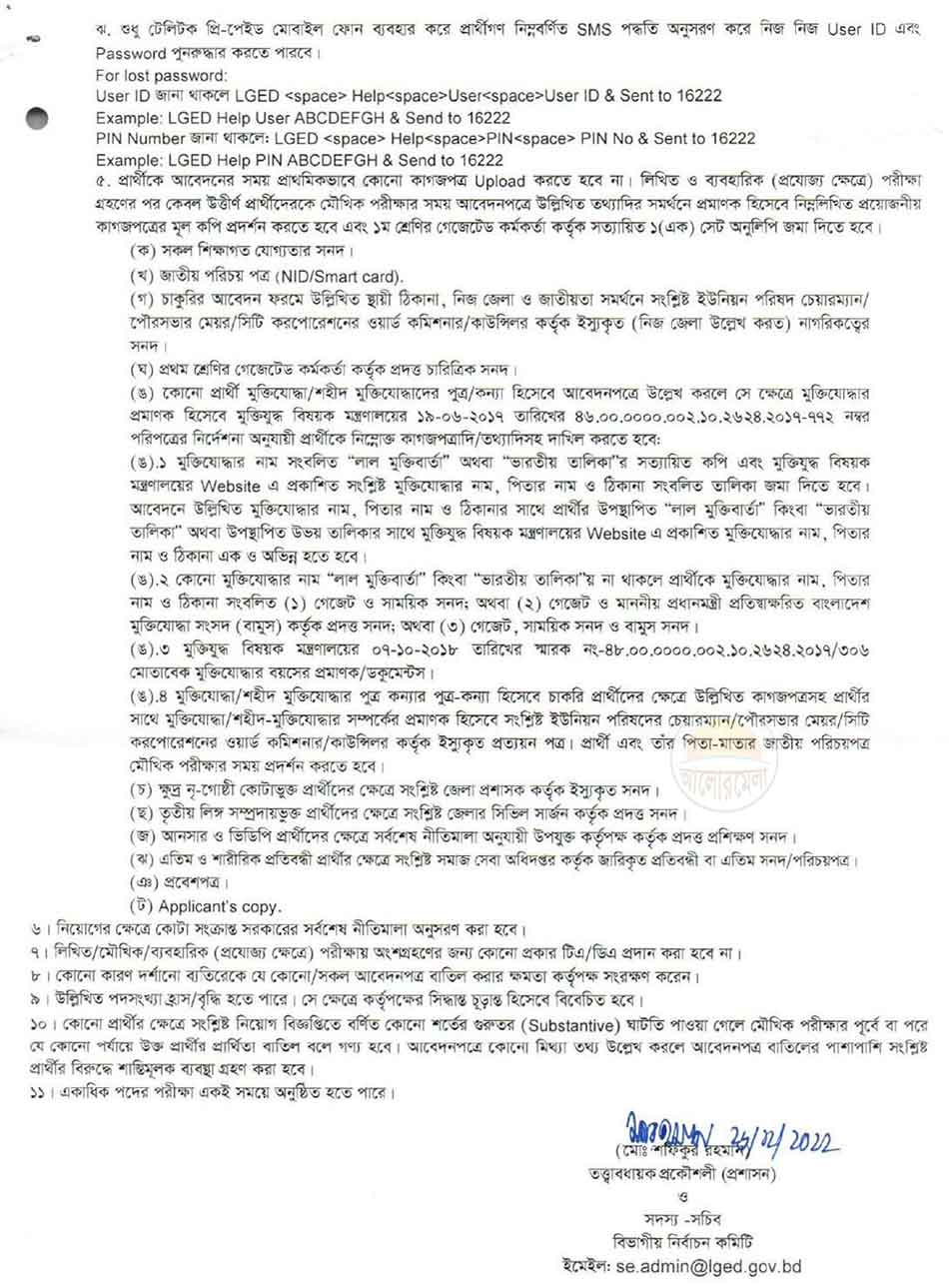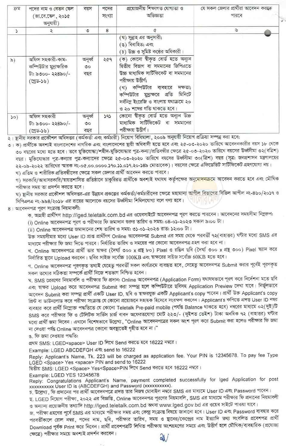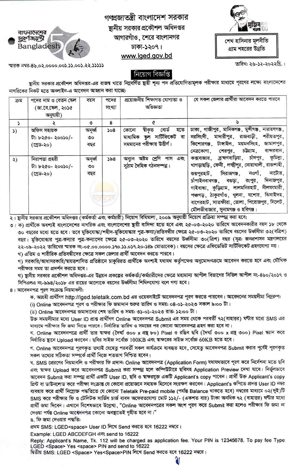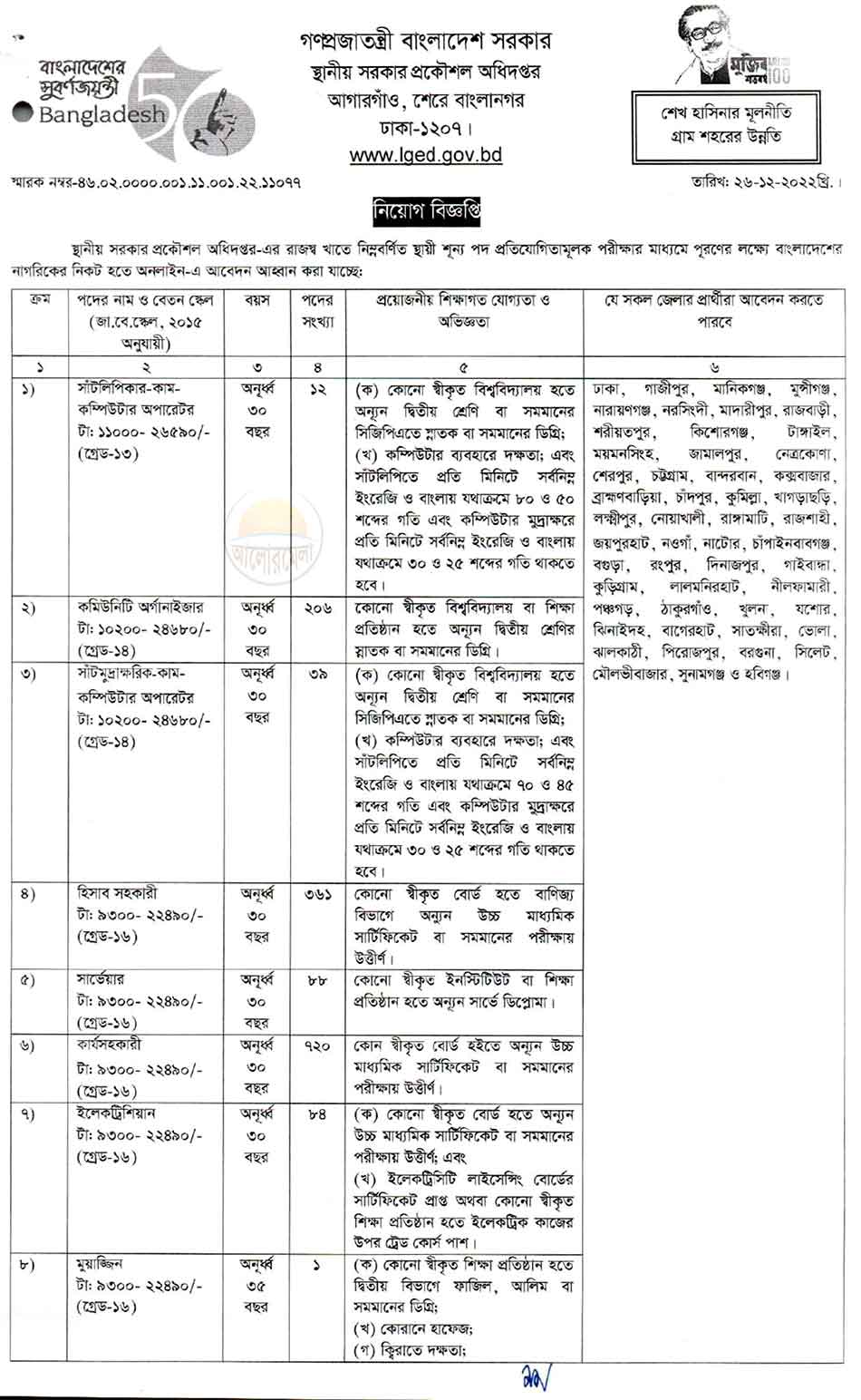 Local Government Engineering Department (LGED) has called application from Bangladeshi nationals for 2237 vacant posts. Requirement qualification should have class eight pass, SSC, HSC or graduation as per job position. The employees will be recruited under 12 categories.