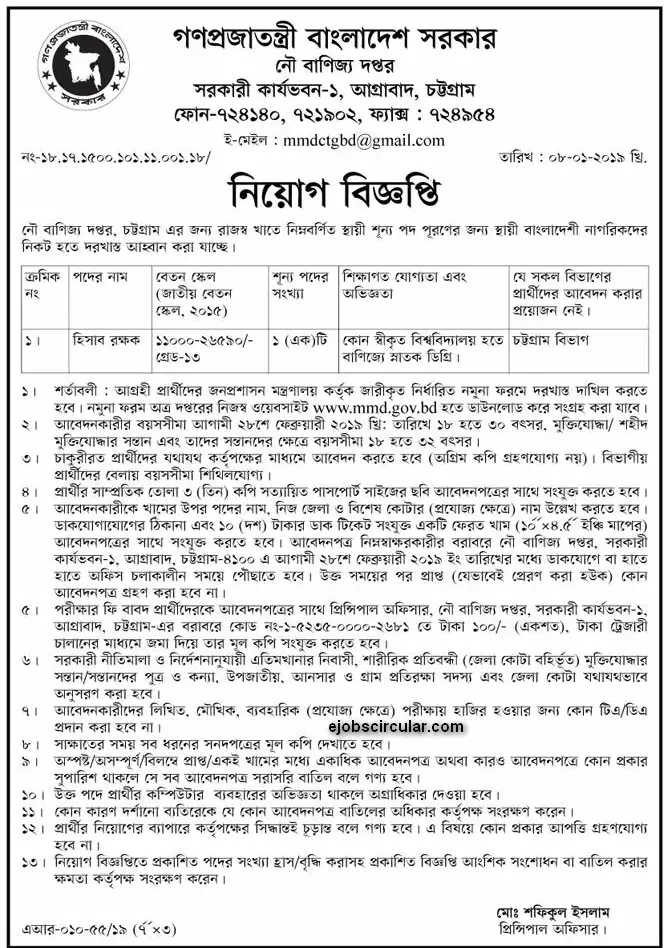 Mercantile Marine Department (MMD), Chittagong has invited application from permanent resident of Bangladesh to fill up vacant position. The vacant posts are Accountant.