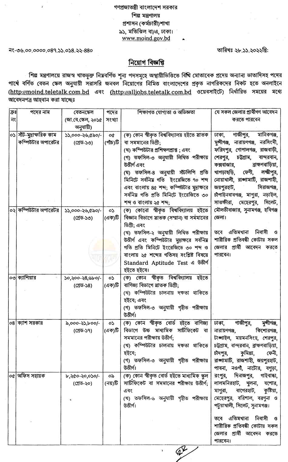 Ministry of Industry has called application from Bangladeshi nationals to recruit for the following posts under the mention terms and conditions. The vacant posts are Steno Typist cum Computer Operator, Computer Operator, Cashier, Office Assistant cum Computer Typist and Office Assistant.