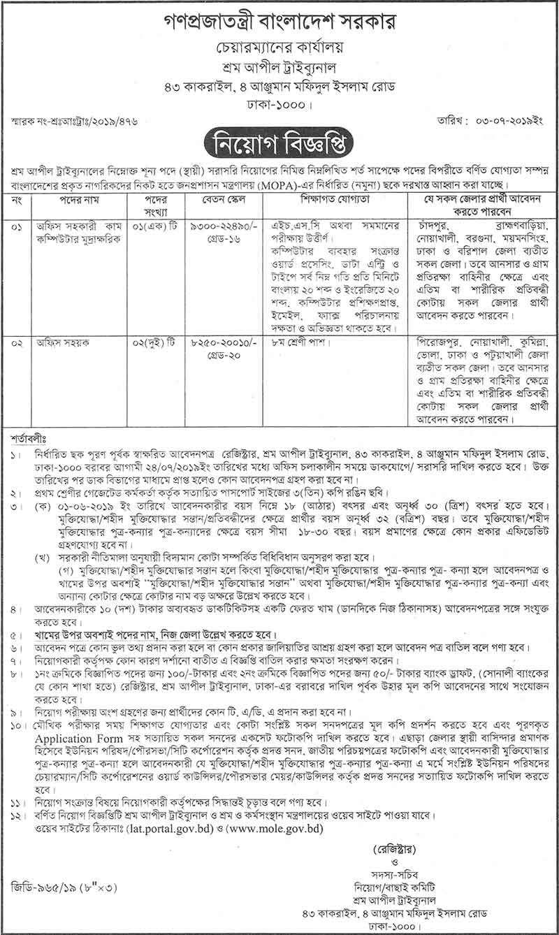 Ministry of Labor and Employment (MOLE) has announced recruitment for the posts of Office Assistant cum Computer Typist and Office Assistant under Lobor Apeel Tribunal.