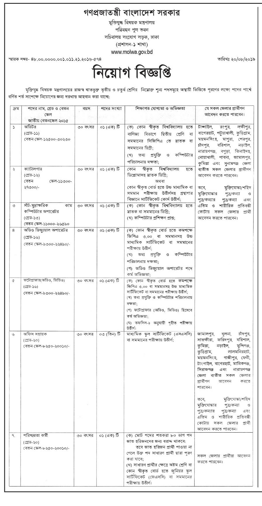 Ministry of Liberation War Affairs (MOLWA) has been published a circular to recruit 3rd and 4th class revenue posts. Only mention district of circular candidates can apply against the vacant posts.