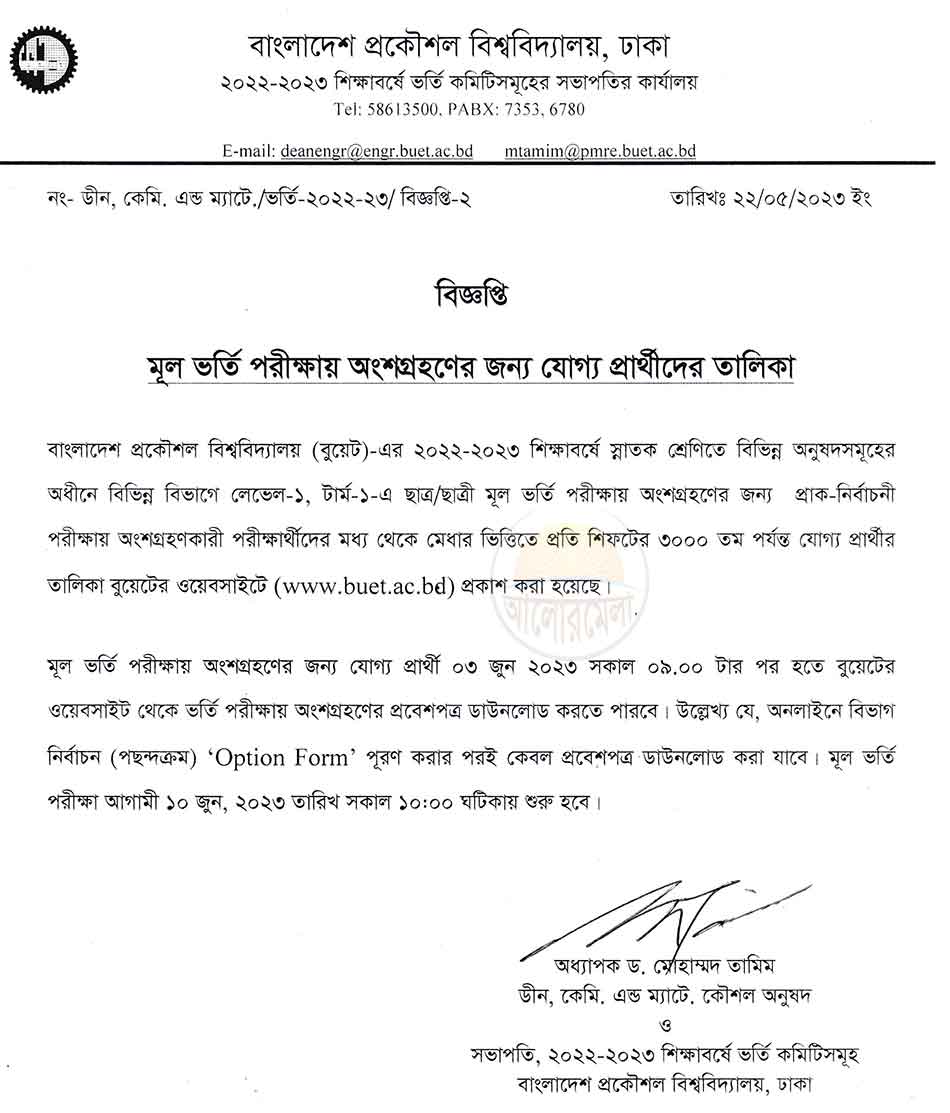 Bangladesh University of Engineering and Technology (BUET) Undergraduate preliminary admission test result has been published in 22 May 2023, total 3,000 candidates selected for final test. Final admission test will be held 10 June 2023. The primary admission test has been done on 20 May 2023.