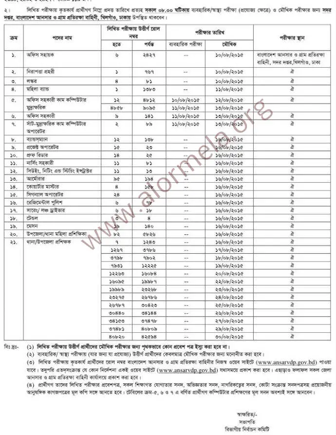 Viva and health test will be started on 10 August 2015 and it will be continuing on 30 August 2015. Exam will be stared on every day 08:00am. Selected candidates must be bring written exam admit card, all educational certificate and other necessary documents during the oral test. Ansar vdp 3th and 4th class written exam result and health and viva schedule are given blow.