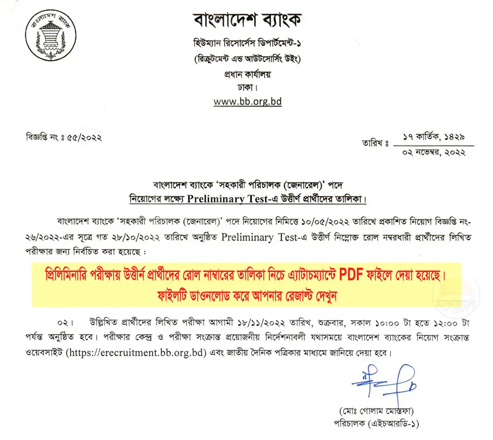 Bangladesh Bank Assistnat Director (General) recruitment MCQ preliminary exam result has been published in 02 November 2022. The MCQ exam was held in 28 October 2022. Total 5,671 candidates has finally selected to attend to written exam.